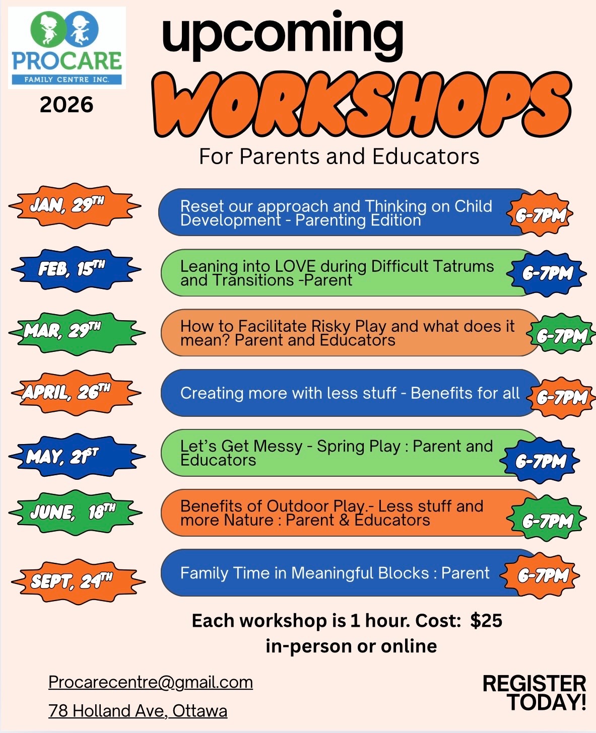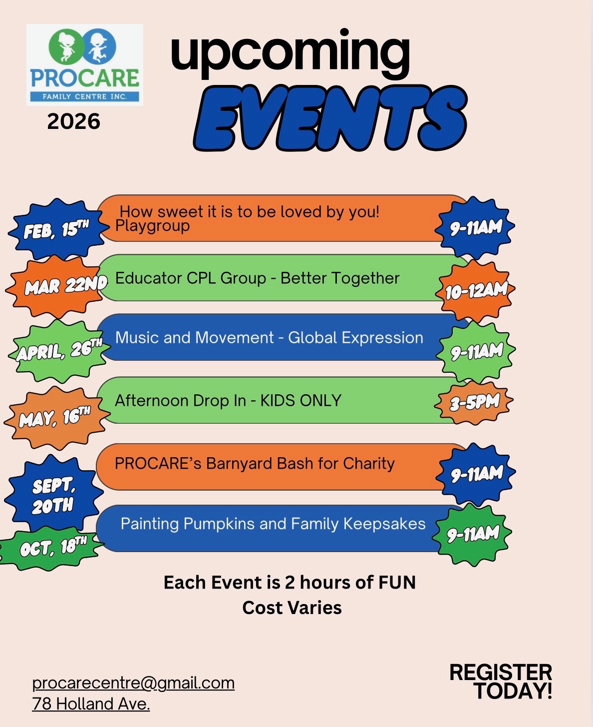 PROCARE Family Centre invites all families with children ages 1-6 years old to enjoy a birthday party at the centre! Birthday parties are available on Saturday and Sunday mornings from 10am – 12pm. Birthday parties can be scheduled by contacting PROCARE Family Centre’s events email at procare.events78@gmail.com and we will return your email promptly. We look forward to celebrating with you! The cost of a Birthday Party Rental is $350 which includes rental of one classroom for 2 hours, a small party decoration package and themed activity stations to match your party. The party package also includes PROCARE staff set up and take down of the party. The host is welcome to attend setup 30 minutes before the party, host or guest attendance outside of the permitted windows may result in additional charges. Additional guests of any age may be added for $25 per person. A signed contract and $50 deposit is required to hold your Birthday party rental($50 will be deducted from invoice at time of payment.. Birthday Party Rentals are scheduled from 10am – 12pm. If extra set up time is needed, an extra 30 minutes can be purchased for $50.00. Additionally, an extra 30 minutes can also be purchased at the end for cleanup if host requires more time to collect personal belongings.